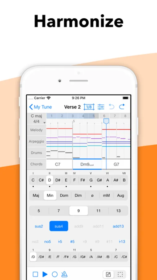 In music, the process of adding chords to a melody is called harmonization. Tune Maker allows you to construct almost any possible chord and it will help you to find chords that mach your melody.