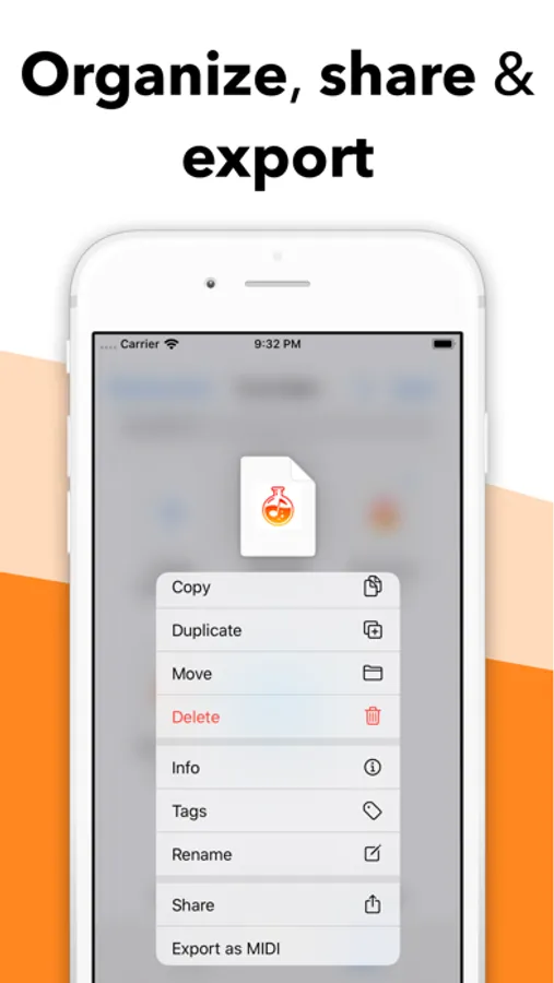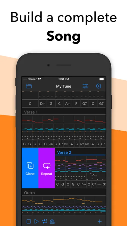 Tune Maker is a Document Based App. This allows you to organize your projects in the way that works best for you. You can store your projects on a local folder, on iCloud Drive, or on any other supported cloud storage like DropBox or GoogleDrive. You can share easily using AirDrop, Mail or Message. You can also export your project as a MIDI file if you want to continue working on it in a DAW like Ableton or GarageBand.