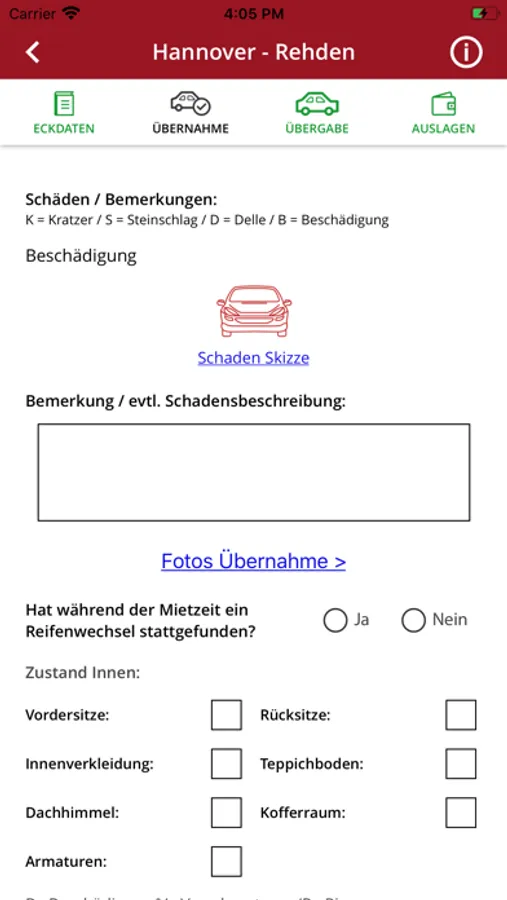 - Übernahmeprotokollierung mit Aufzeichnung des Fahrzeugzubehörs, Funktionscheck, Bilder Übernahme und Unterschriftsaufzeichung
