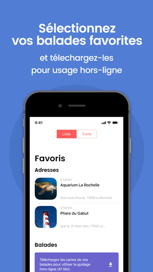 Pour sillonner au mieux les environs sans vous soucier de votre connexion mobile, sélectionnez vos balades favorites et téléchargez-les pour un usage hors-ligne. Retrouvez-les dans “Mes favoris”.