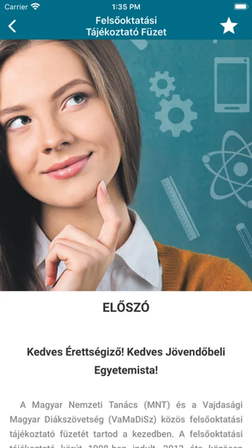 A Magyar Nemzeti Tanács (MNT) és a Vajdasági Magyar Diákszövetség (VaMaDiSz) közös felsőoktatási tájékoztató füzetét tartod a kezedben. A felsőoktatási tájékoztató körút 1998-ban indult, 2013 óta közösen valósítja meg a Magyar Nemzeti Tanács és a Vajdasági Magyar Diákszövetség. Ily módon, kedves leendő Kolléga, eléd már ez a tartalomgazdag, minden kérdésre választ adó kiadvány került.