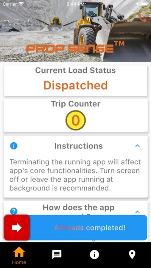 Info section of the app shows details of the load like Tonnage, Status, Truck No, Max Load Size, Loading Plant, Destination Plant etc., The App uses firebase to log exception and important information about the current load.