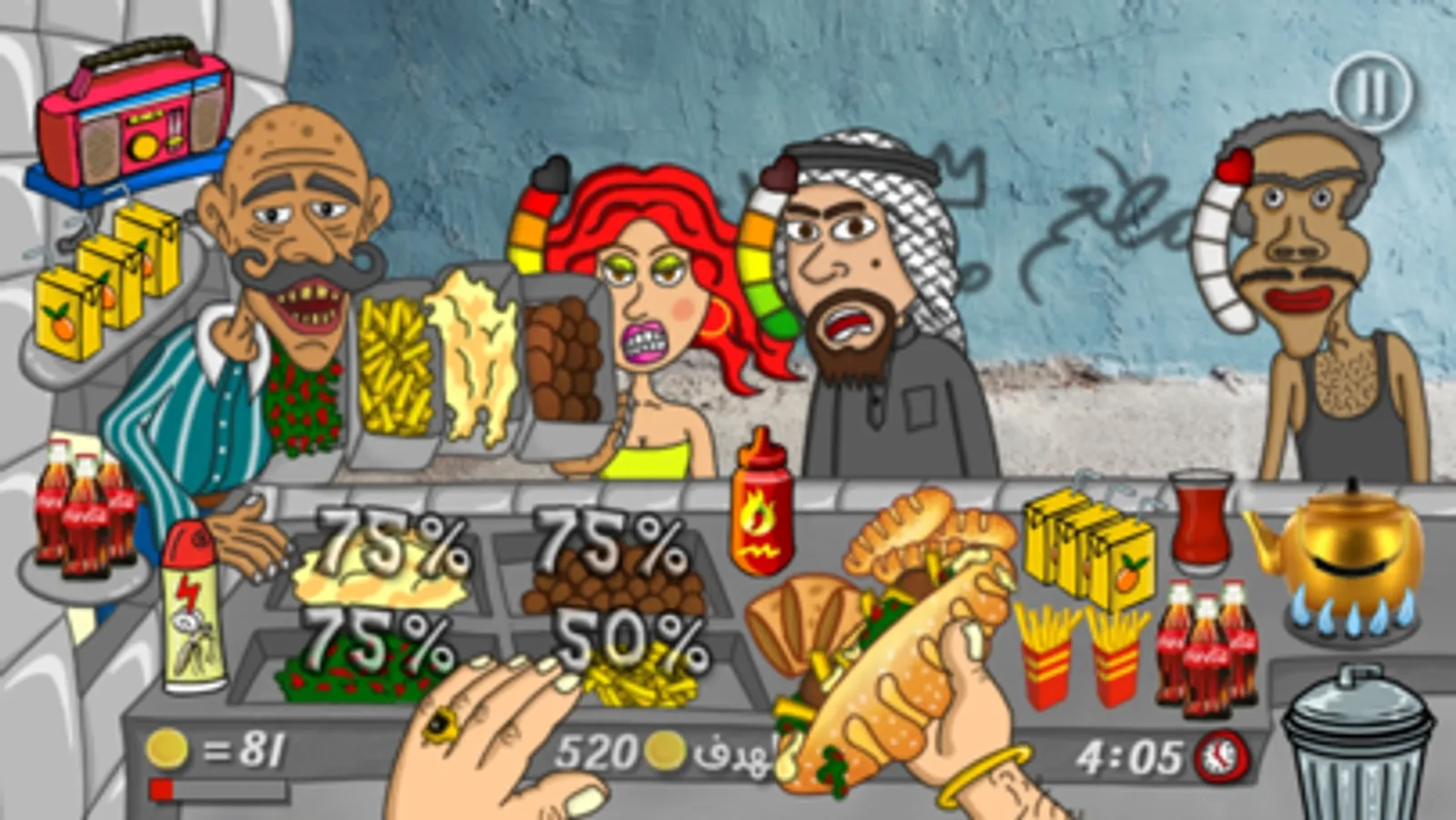 ◆An Arabic restaurant game containing chickpeas, falafel, salad, fries, orange juice and Pepsi Cola