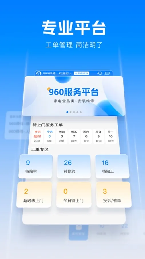 960致力于提供高效、品质化的上门服务,满足用户维修、安装、清洗的需求。服务覆盖全国范围。平台拥有上千厂家及百万客户资源,单量大、收入稳定、结算快速。