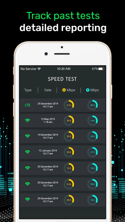 - LTE, 3G, 4G and Wifi speed testing with one tap