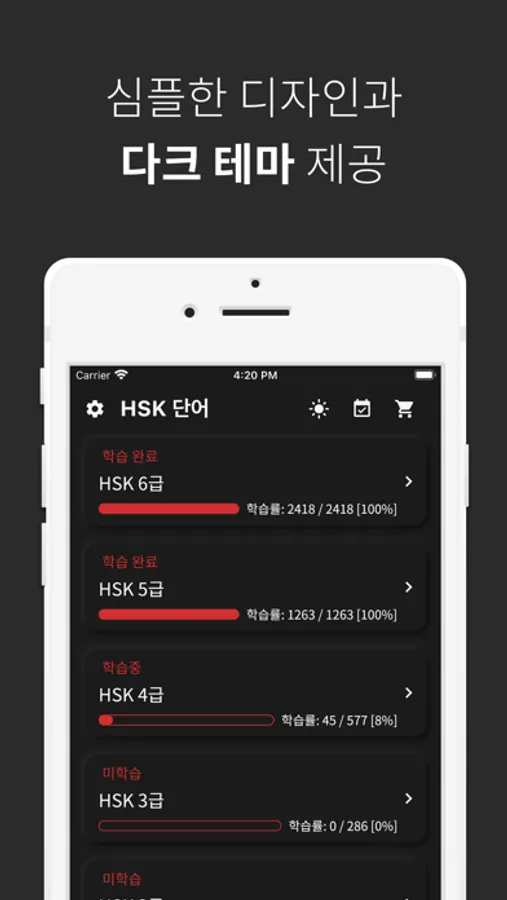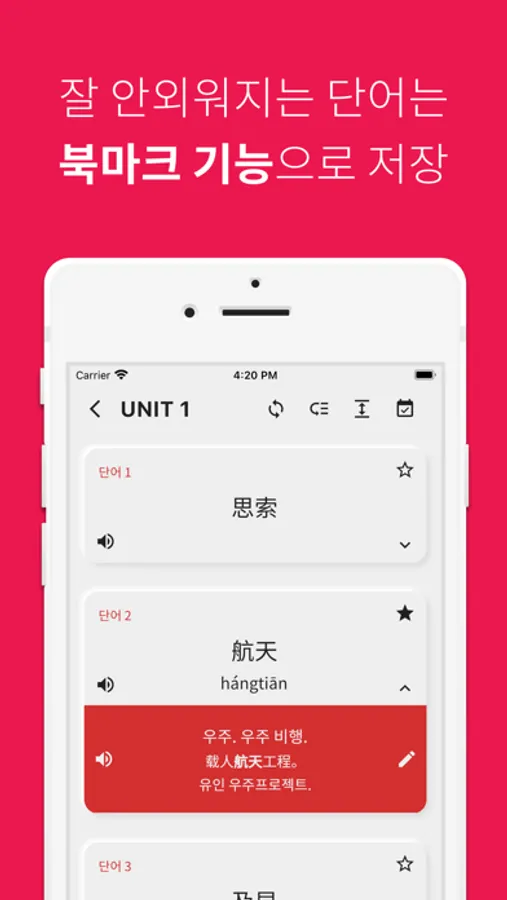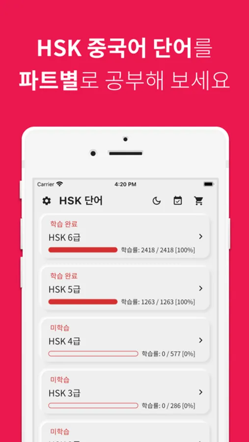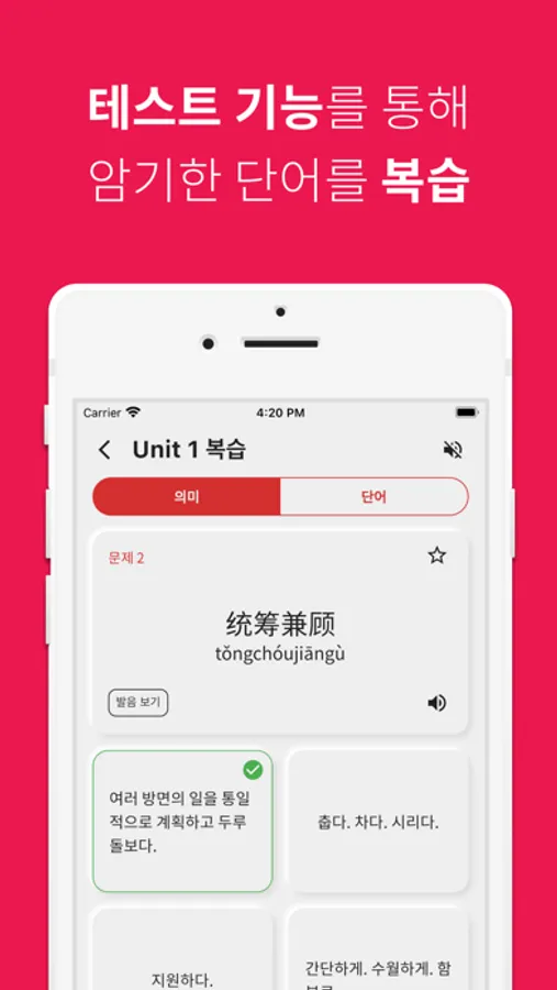 단어 공부는 역시 반복이죠! 공부한 HSK 중국어 단어를 파트별, 유닛별, 전체 단위별로 복습할 수 있습니다.