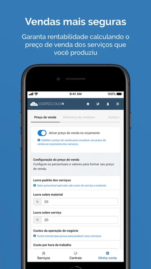 O Cortecloud também te ajuda a atender e negociar encomendas com seus clientes. No aplicativo, você pode configurar o preço de venda do seu serviço, atualizar as estimativas de custo em tempo real enquanto conversa com o cliente e ainda compartilhar com ele o orçamento final para fechar seu serviço