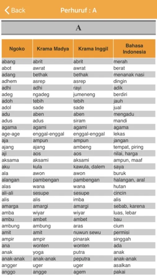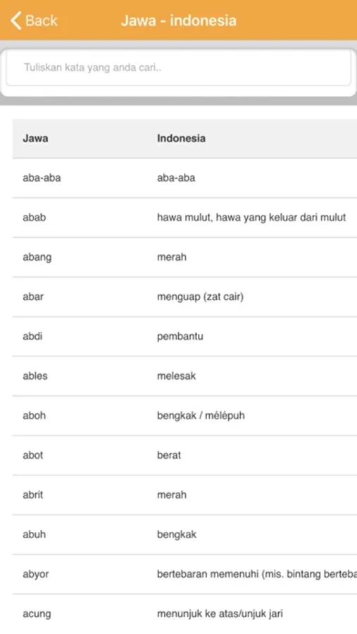 Cocok dipelajari untuk pemula yang baru mulai belajar percakapan Bahasa Jawa. Dapatkan puluhan ribu kosakata Jawa dalam kamus kecil dan ringan ini. Aplikasi sepenuhnya offline dan tidak membutuhkan koneksi internet sama sekali untuk menggunakannya.