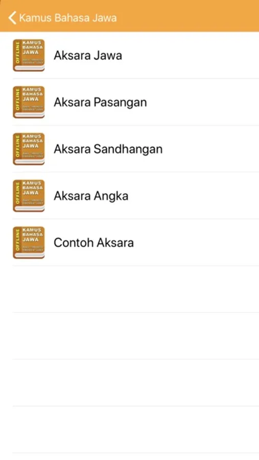 Aplikasi Kamus Bahasa Jawa Indonesia Lengkap (Terjemahan/Translate). Berisi kumpulan kosakata Bahasa Jawa yang diterjemahkan ke Bahasa Indonesia, serta kosakata Bahasa Indonesia yang diterjemahkan ke Bahasa Jawa (Ngoko, Krama Madya, & Krama Inggil). Juga dilengkapi dengan aksara jawa, pasangan, sandhangan, hingga aksara angka.