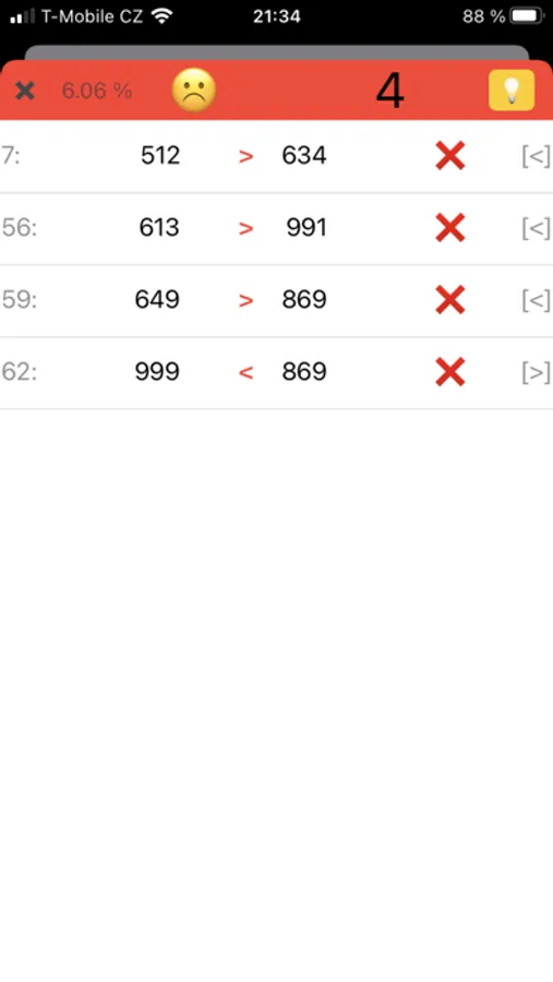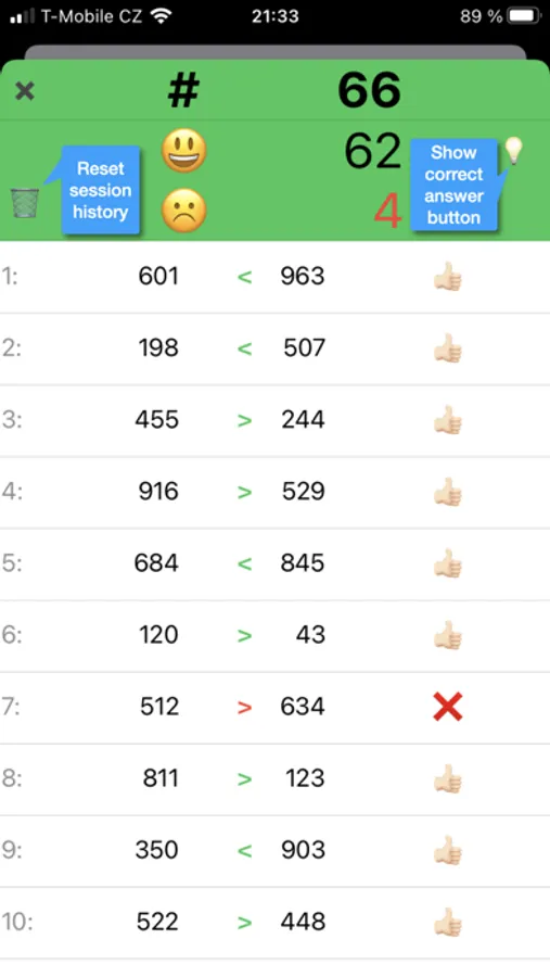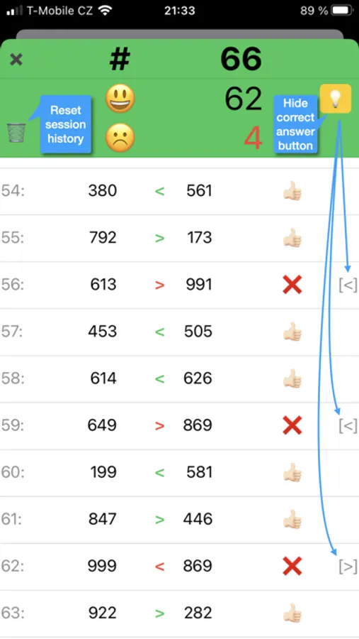 — When the Session history list contains some wrong answers, the correct answer may be shown (or hidden) by tapping on the lightbulb icon. Hiding of correct results for wrongly answered exercises when the Session history list is open lets young students to thing about the exercise again before seeing the correct answer.