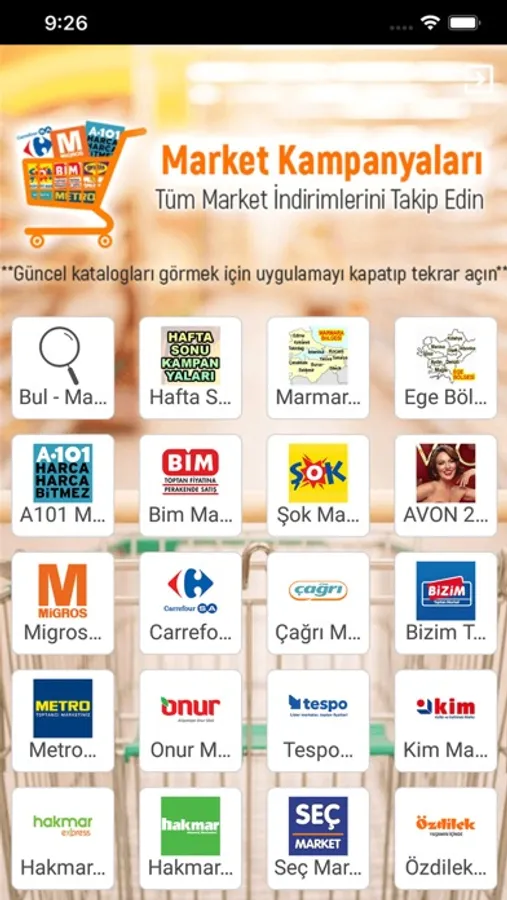 A101 aktüel ürünleri, Bim Aktüel, Şok Aktüel, Carrefour Aktüel Katalog, Migros Katalog Aktüel,Metro Katalog ürünleri, Happy Center Kampanyaları,Gratis Katalog Ürünleri,Watsons Akteül gibi market kataloglarına yer verilmektedir. Marketlerdeki güncel Kampanya kataloglarını tek uygulama üzerinden takip edebilirsiniz. Her yeni aktüel ürün kataloğunda bilgilendirme Sms'i alırsınız.