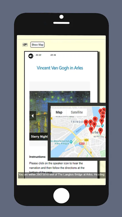 The 'Van Gogh in Arles' app reveals the story of the artist as you move from location to location in the marvelous city of Arles. It uses your device's GPS to guide you and to present audio, text and Van Gogh's letters and paintings matched to your location.