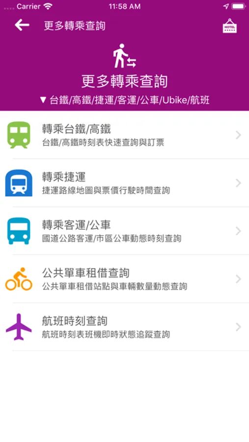 自動串連鐵路/捷運/客運/公車/Ubike/航班時刻表等查詢與訂票服務,以及天氣預報/訂房比價/美食景點/自助旅行行程攻略分享等旅遊相關資訊,所有交通轉乘實用查詢工具一次全部到位!