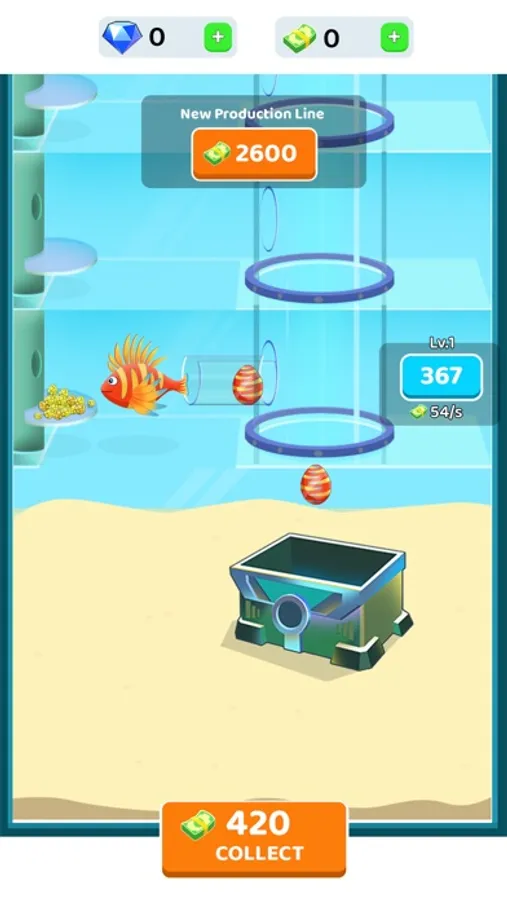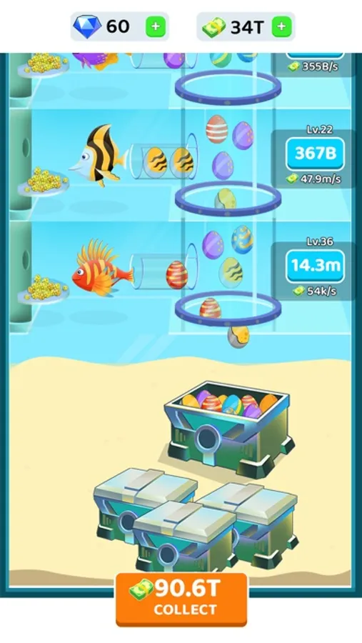 - Collect eggs to earn money and use it to buy new fish habitat