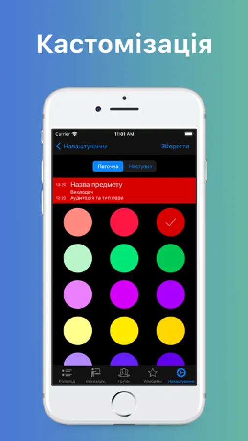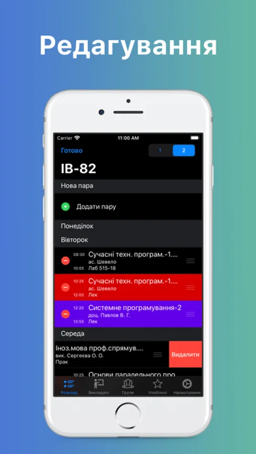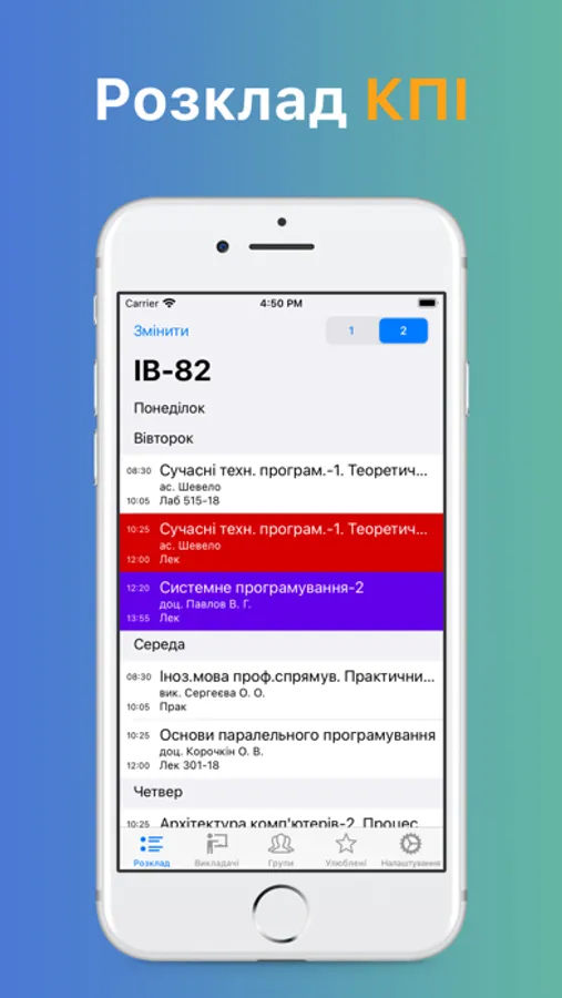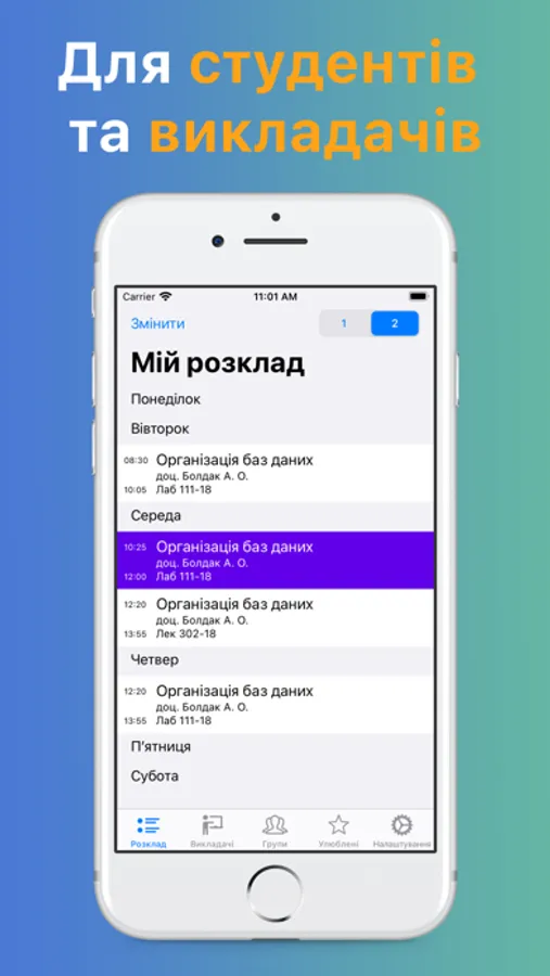 Є список «Улюблені», куди можна додати розклад інших груп та викладачів для швидкого доступу.