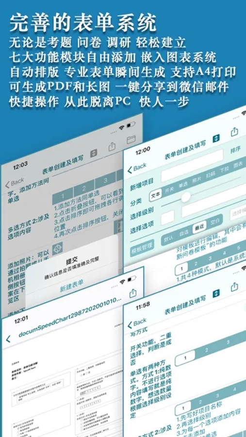针对移动平台屏幕小,排版修改不便,利用移动设备便携性及快速操作的特点,满足很多场合对专业版式文章及表单的发布速度要求,致力打造全新操作方式撰写文章,编辑表单,生成图表,发布问卷的制作平台,可分享至微信及邮箱。