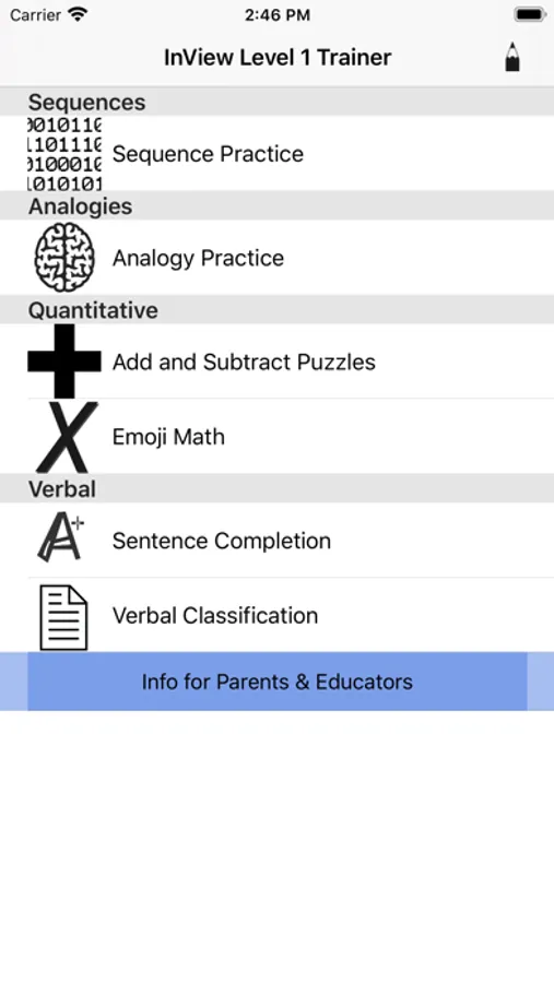 Updated for 2020! Train for gifted and talented testing. This app is designed to increase reasoning and problem solving skills for grade school kids. Specifically the exercises within are for mastering the InView Test Level 1 for second and third graders.