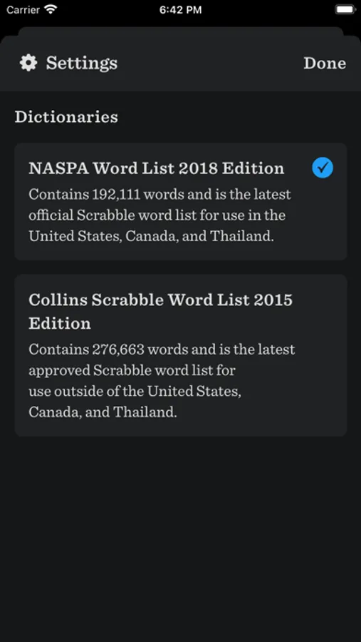 This app also provides the choice between four official SCRABBLE® dictionaries: