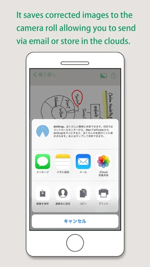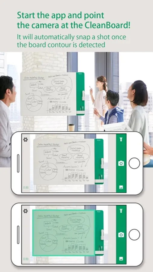 Start this App after installation to shoot the CleanBoard surface (where writing exists). This action will enable the app to automatically detect the contour of the writing surface and creates an enhanced digital data image after corrections such as keystone correction (data format is your choice of JPEG or PDF). You can easily share or organize the data saved in the camera roll and send via email or store in the cloud.