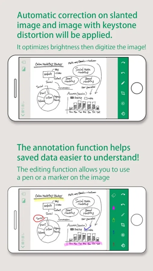 When the written surface of CleanBoard is within the shooting range, Clean board automatically recognizes the written area and snaps the image. The App corrects the tilt and keystone to create an optimized image.