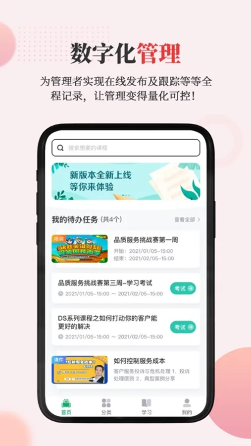 2.数字管理:管理者实现在线发布、在线跟踪,同时导出学习报表功能,完成对培训计划的全程数字化记录。支持单个/多个的视频、PPT、Word、PDF等资料上传。一站式管理,就是这么简单。