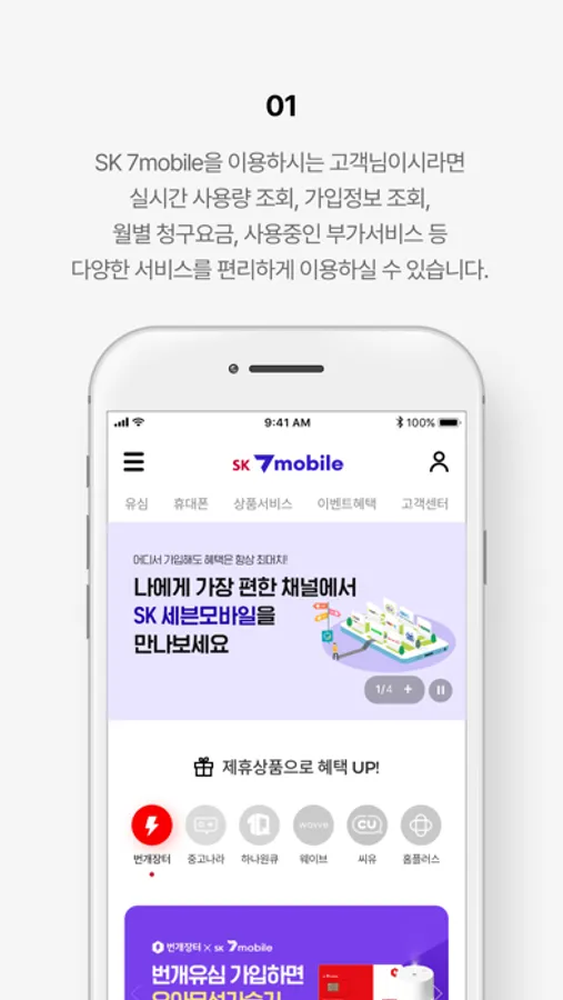 • 상품서비스 : 혜택 가득한 다양한 제휴상품과 해피콜 기다릴 필요없이 원하는 시간에 내손으로 셀프개통하세요.