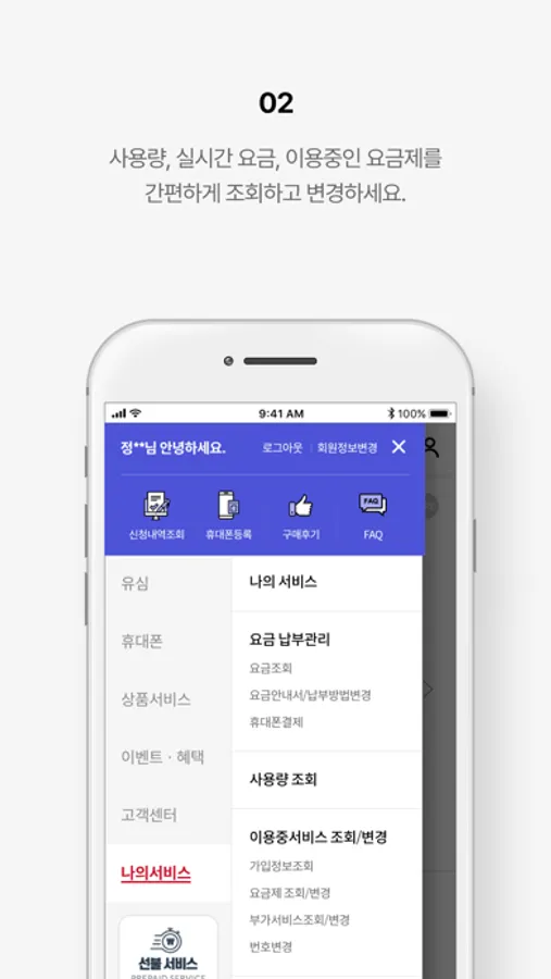 • 나의 서비스 : 사용량, 실시간 요금, 이용중인 요금제를 간편하게 조회하고 변경하세요.