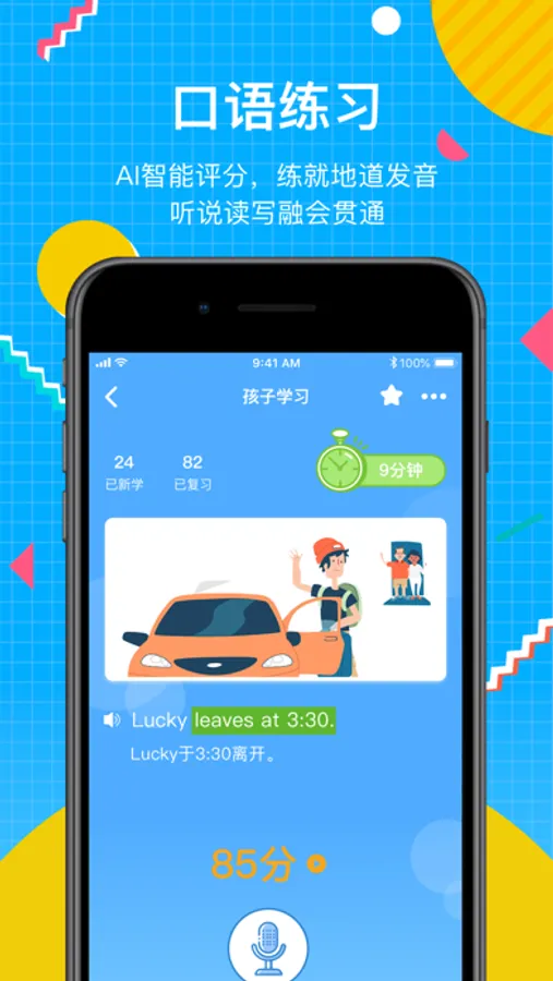 英文句子配有学生跟读和语音测评的功能,录音完成回放自己的发音,从小学阶段就开始纠音,练就地道发音