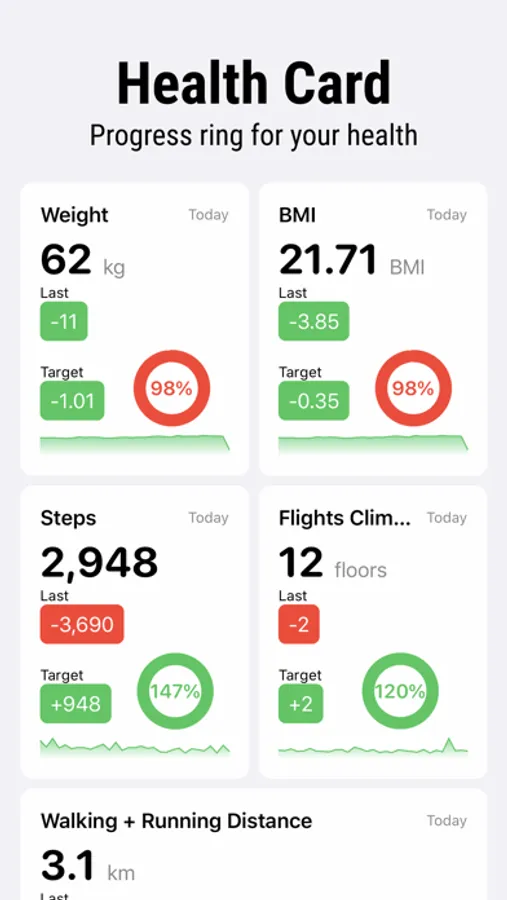 HealthMinder card show weight, steps and more health info. Your health progress are showing in ring and how farther from target.