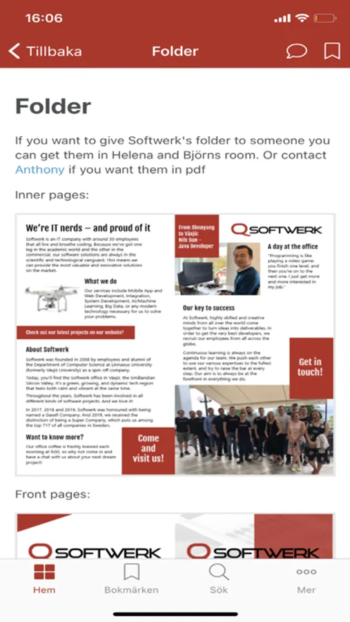The purpose of the app is to be used as internal guidelines for the employees of Softwerk AB, and to provide insights into the company and its on-goings to the public. It's supposed to transfer knowledge, processes, workflows, general and specific policies, roles and responsibilities, interfaces between different activities, reporting, etc. within Softwerk as an organization.