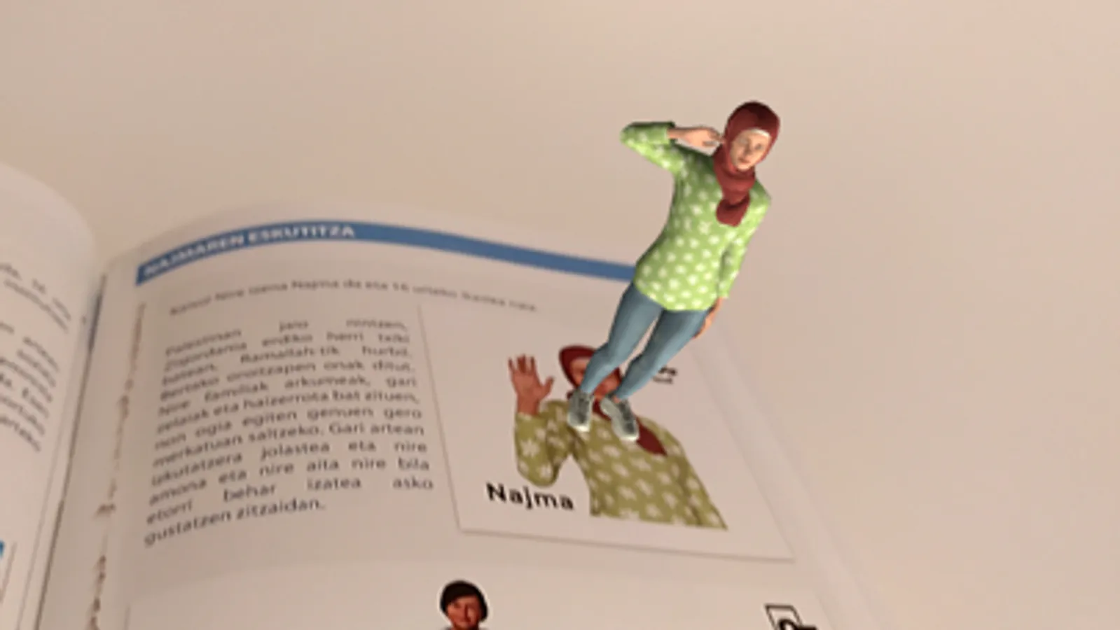 Esta app funciona junto al libro "La mochila de Najma". Puedes descargar el libro en pdf desde otro dispositivo u ordenador para mostrarlo en pantalla o imprimirlo. Después, enfoca desde este dispositivo al libro para disfrutar de la experiencia en realidad aumentada. Encontrarás más información en la página 5.
