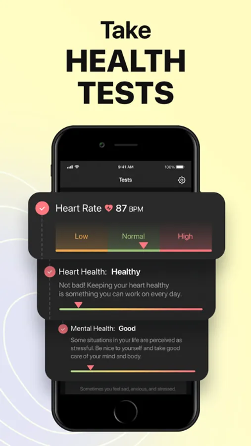 Simply place your finger on the camera to measure your heart rate. Monitor your pulse, blood pressure, and oxygen saturation. Receive reminders to check your pulse and track your vitals on a daily basis so you can stay healthy and fit. Get your stress levels under control and negative emotions identified and leveled.