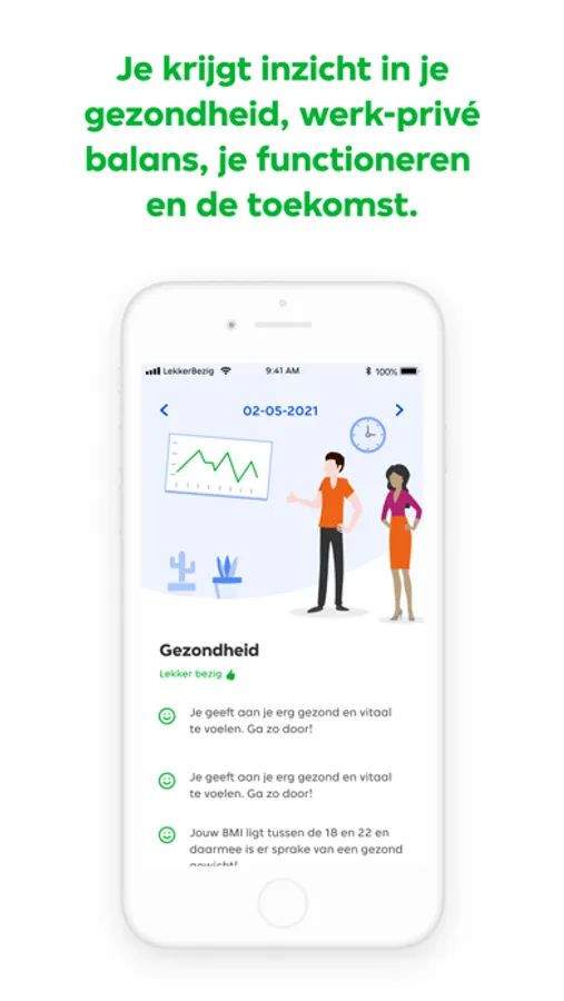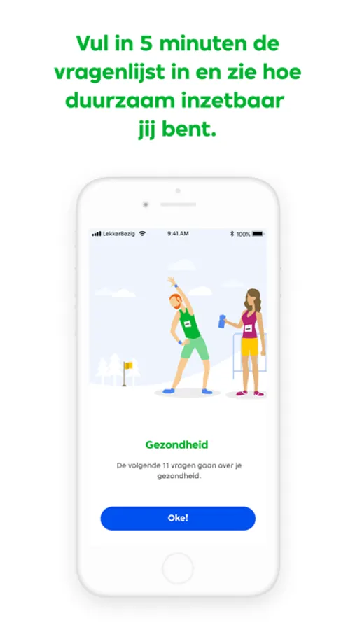 Hoe duurzaam inzetbaar ben jij? Doe de test en ga direct aan de slag! Deze app is speciaal ontwikkeld voor medewerkers van bedrijven die deelnemen aan het Lekker Bezig Programma. Het geeft je inzicht in je gezondheid, werk-privé balans, je functioneren op het werk en je toekomst. De app bestaat uit een online test, een advies en diverse oplossingen.