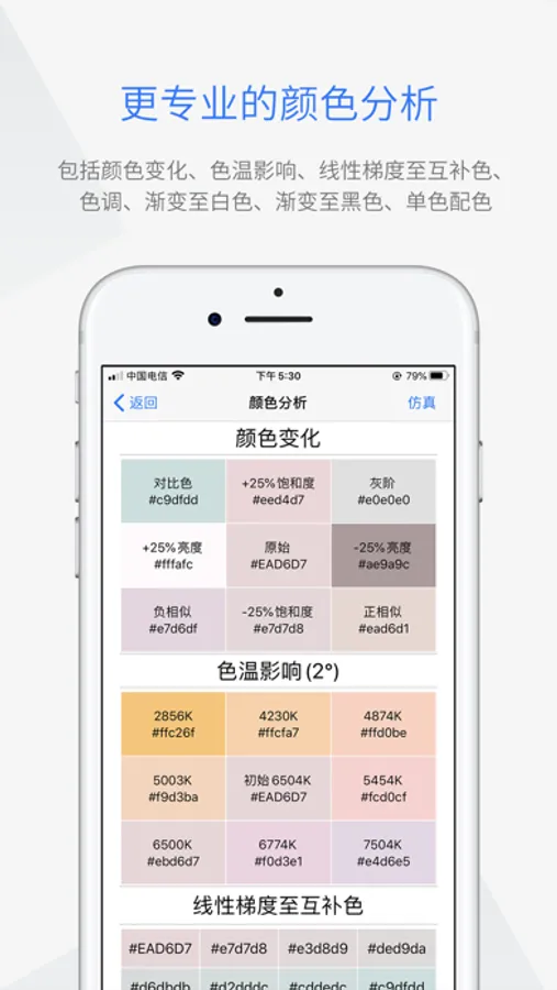 该APP主要为设计师进行色彩搭配设计时,提供强有力的工具。无论专业设计师还是普通用户,通过APP都能找到配色灵感,并轻松设计出独一无二的好色彩