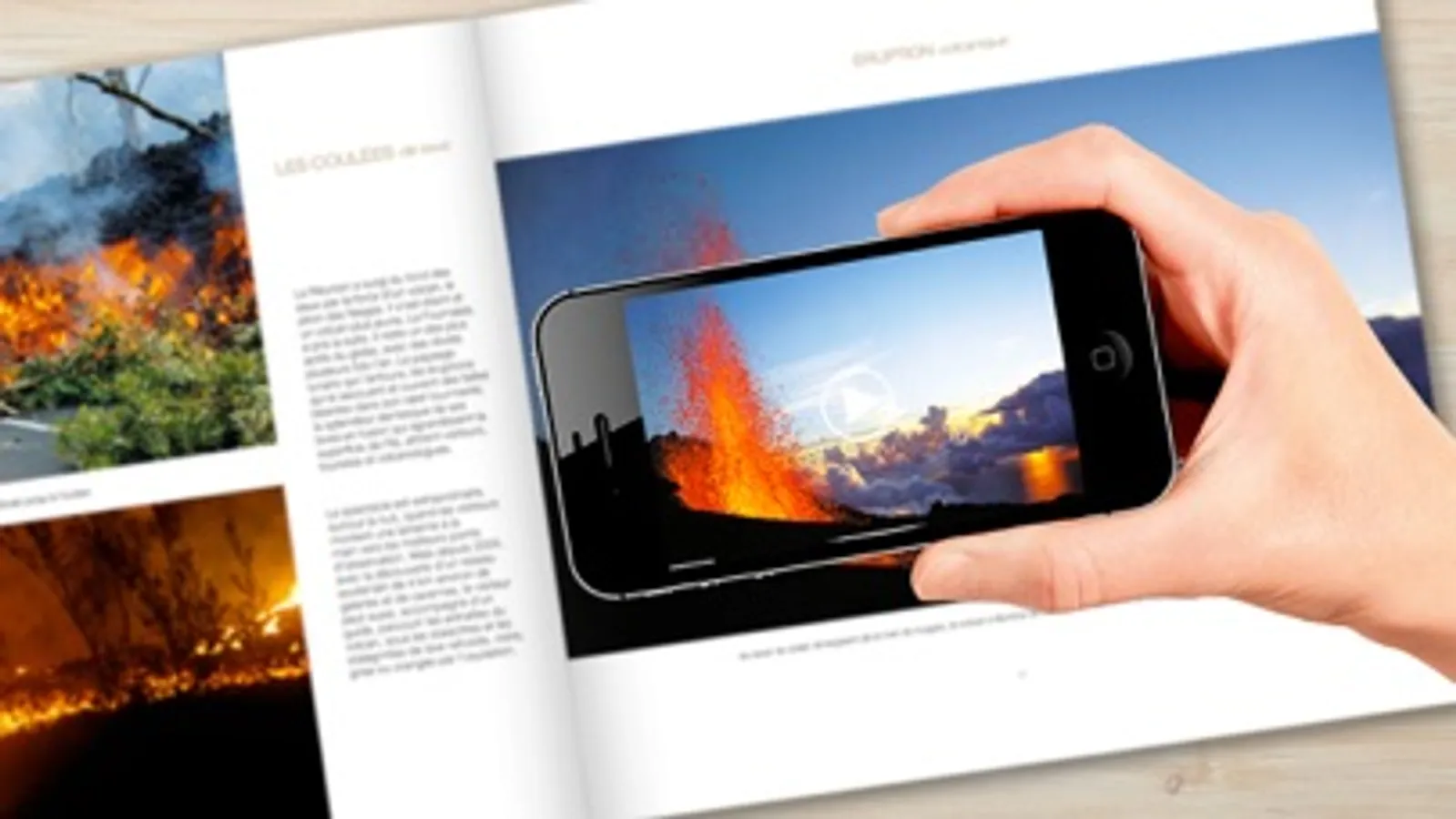 Placer le smartphone ou la tablette au-dessus de l’image du livre pour vous plonger dans la réalité augmentée et voir la photo se transformer en vidéo.