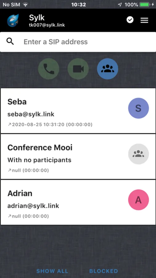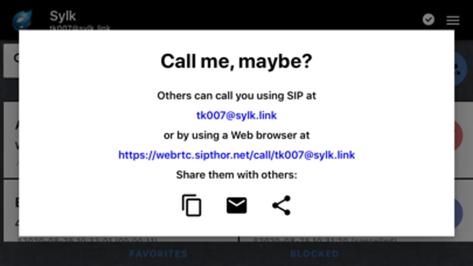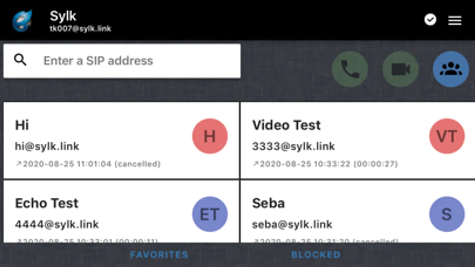 Sylk Mobile is part of Sylk Suite, a set of real-time communications applications using IETF SIP protocol and WebRTC specifications. With it you can call to any other SIP address and you can receive calls from SIP applications and WebRTC browsers.
