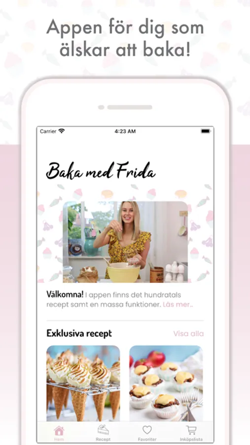 Här får du exklusiva recept skapade endast för appen blandat med godsaker från Fridas Bakblogg. Frida kommer varje vecka att uppdatera appen med nya, exklusiva recept.