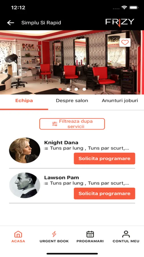Te ajutam sa iti gasesti salonul preferat,dar si cel mai apropiat,pentru o programare last minute.Iti afisam echipa salonului,agenda profesionistilor,serviciile acestora,preturile si durata.Programari online direct de pe telefonul mobil,oriunde si oricand!