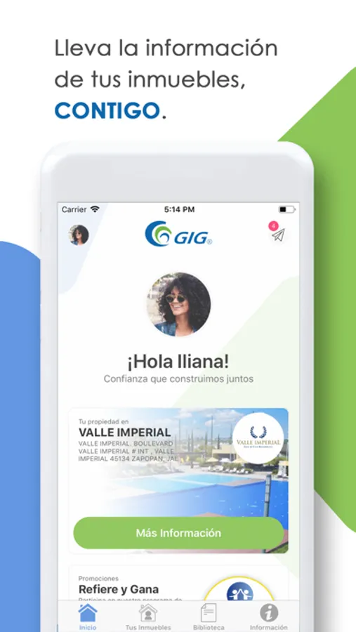 * Consultar la noticias y avisos relacionados a GIG y a tu inmueble.