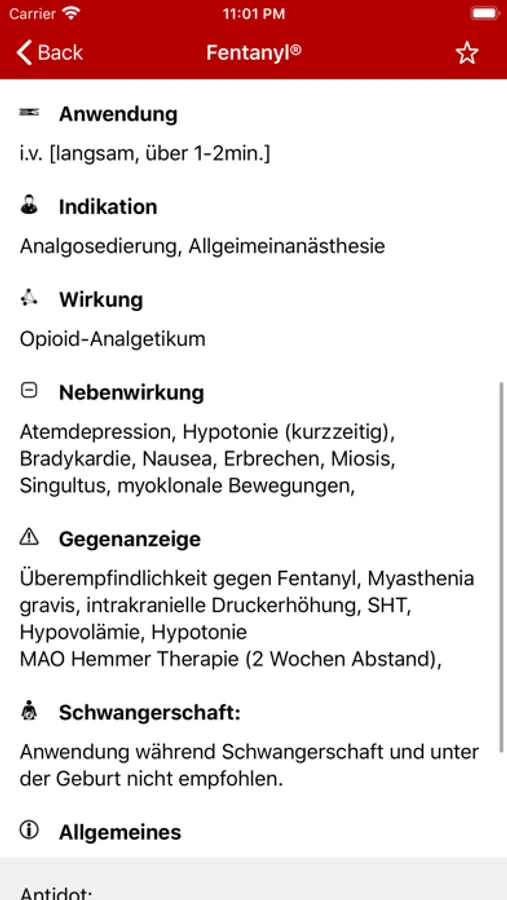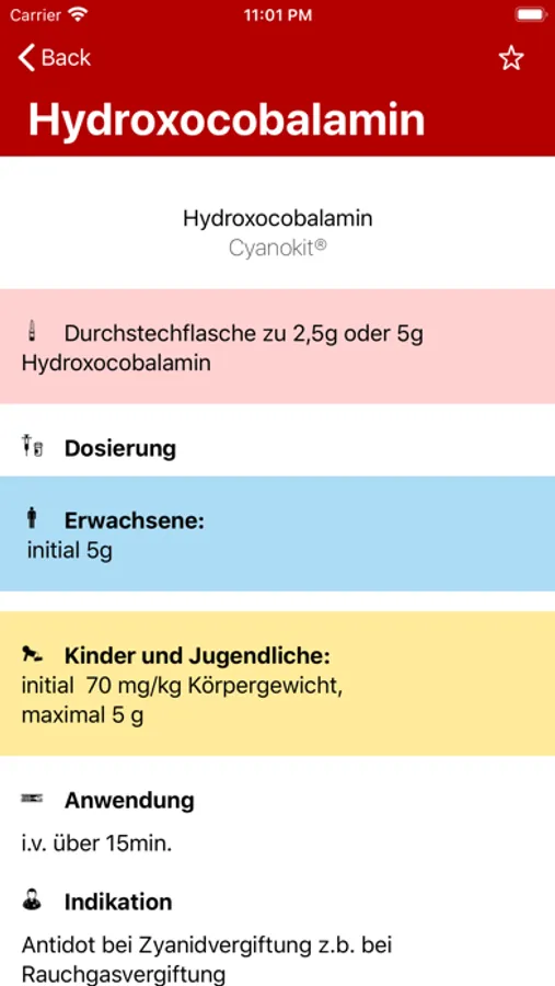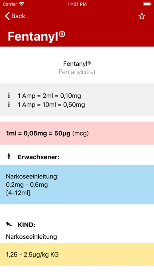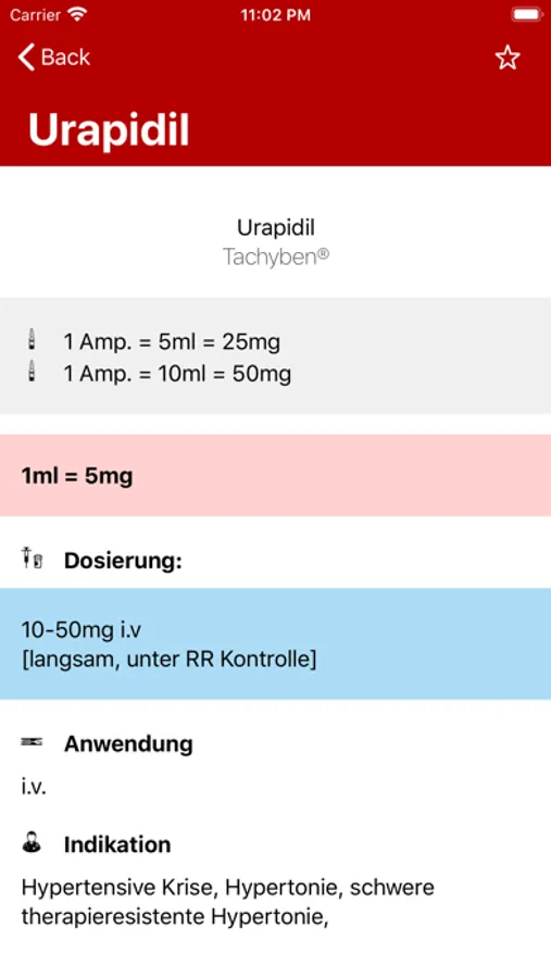 Die Medikamente sind übersichtlich alphabetisch angeordnet und durch die Menüführung rasch auffindbar. Die erhältlichen Ampullengröße sowie die darin enthaltende Dosierung werden für jedes Medikament übersichtlich angegeben.