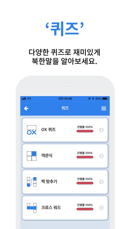 북한말을 OX퀴즈, 객관식 퀴즈, 짝 맞추기 퀴즈, 크로스 워드를 통해 북한말을 알아보세요.