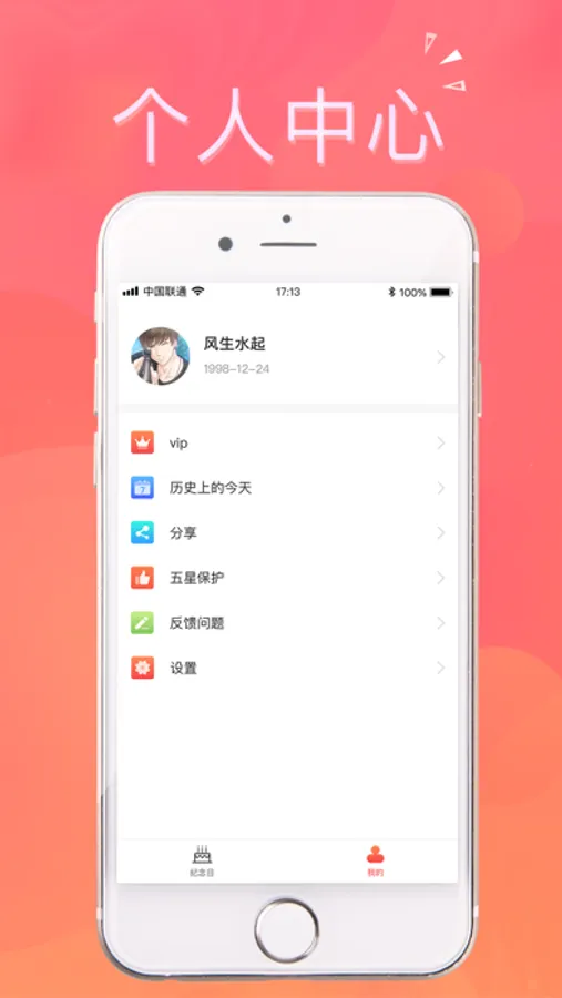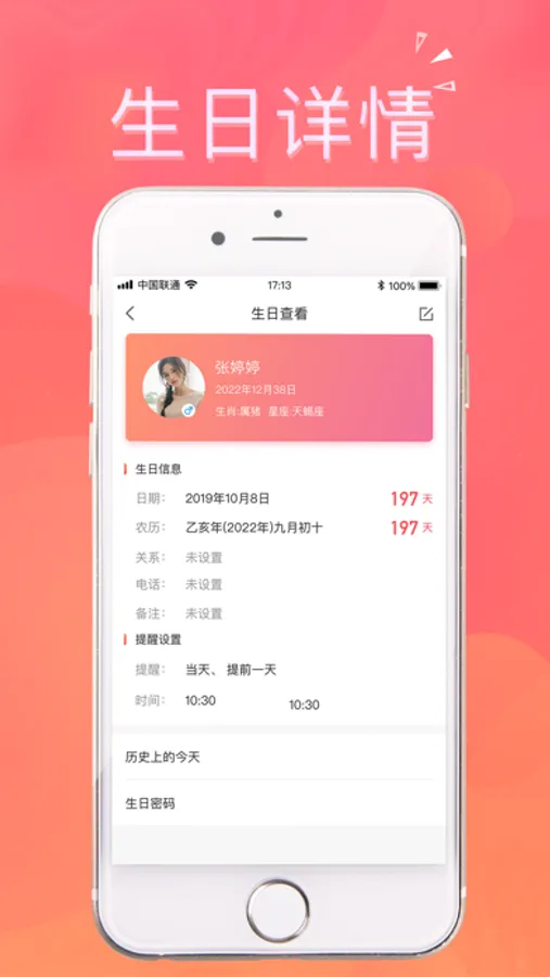 生日、纪念日、倒数日、节日多种类型,支持公历农历