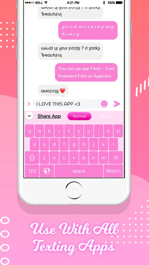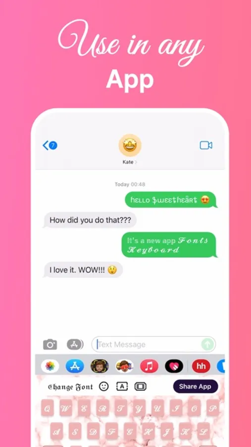 Fonts Keyboard works perfectly with Instagram, Snapchat, iMessage, WhatsApp, Skype, Messenger and other texting apps.