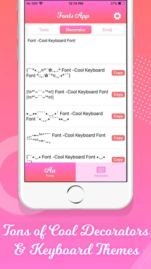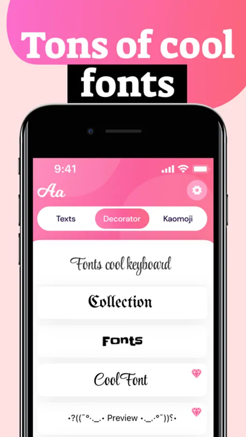 • Font Decorator: Create fun messages with decorations, {•------» Like this! «------•}. Or easily copy cute Kaomojis to send to your friends (^▽^)
