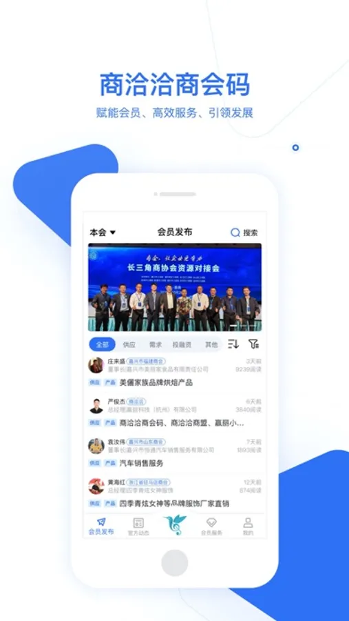 商会码会员企业端包含:会员供需发布,会员服务,商盟小店,电子名片,定制小程序等功能。