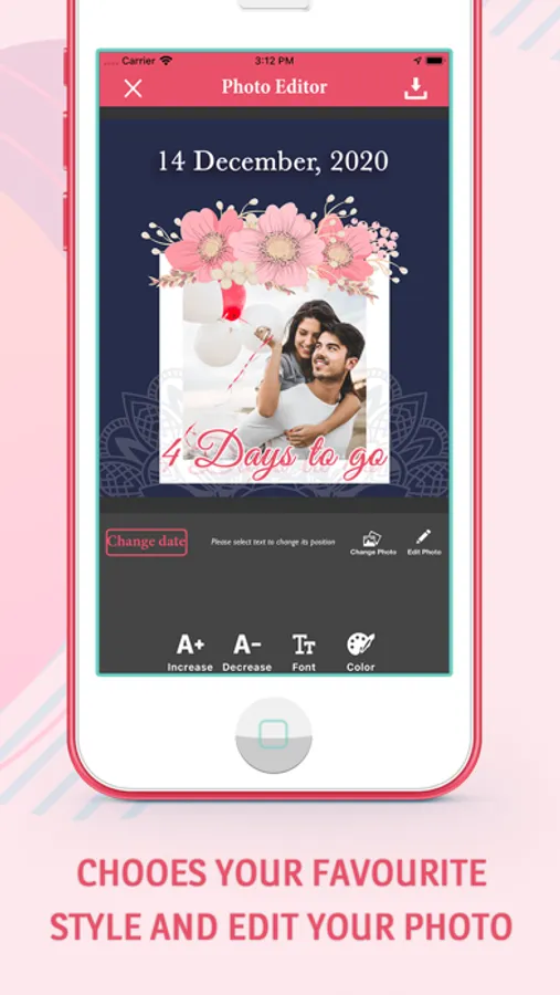 App to create photo frame with texts like 5 days to go, 7 days to go, 3 months completed for your baby, engagement date, wedding date, engagement anniversary, marriage anniversary and a lots more.
