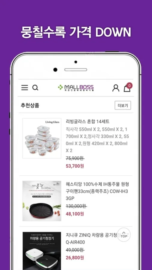 몰보스는 바로 오늘, 지금의 트렌드에 맞춰 똑똑한 아이템을 선정하고 회원에게 쉽고 빠르게 공유되며 함께 구매하는 최저가 상품구매를 실현합니다.
