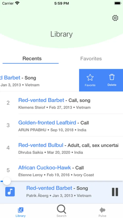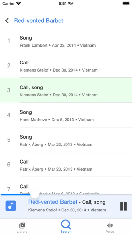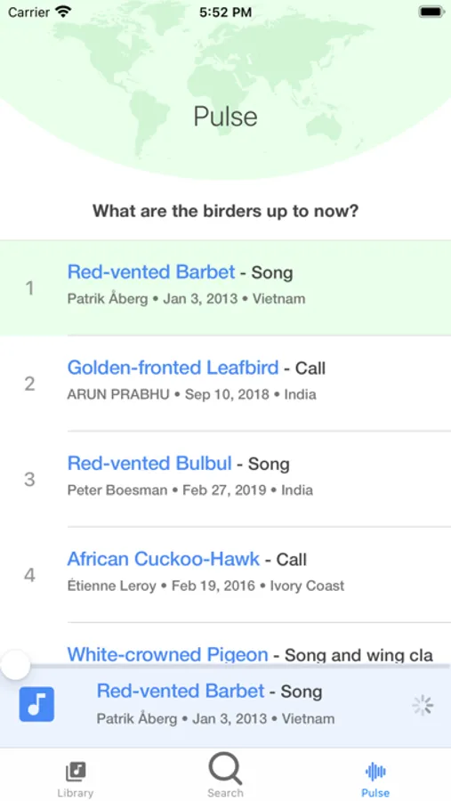 Search, Play and Organize thousands of bird calls and sounds. Bird Calls & Songs fetches the calls from xeno-canto database. The app allows for storing the sounds for offline use and plays them in loop. The easy-to-use search locates the species quickly and sample. The pulse feature displays what the other birders are looking for around the world.