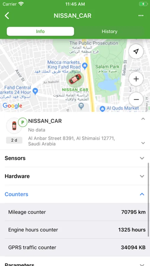 - Map mode. Access units, geofences, tracks and event markers on the map with the option to detect your own location.