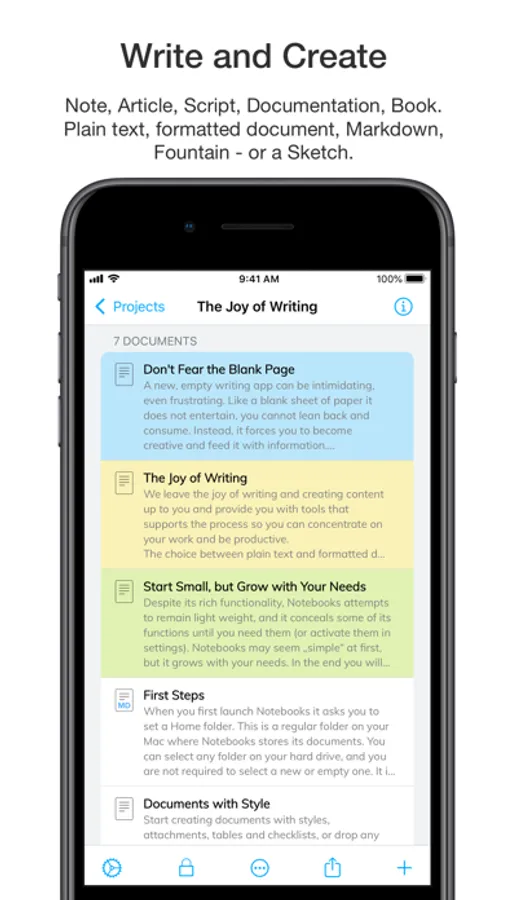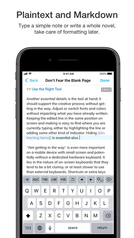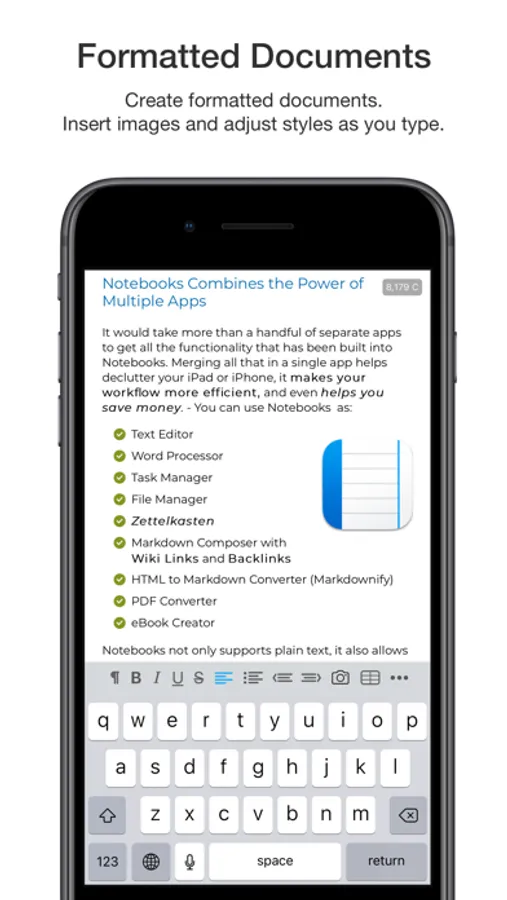 • Use Markdown to create formatted documents from plain text. Notebooks supports *MultiMarkdown* and its own flavor of *Discount*. – Click any word in a formatted Markdown text and start writing at that position. You can even create checklists (- [ ]) and tick them off in formatted view. Syntax highlighting and a set of dedicated extra keyboard keys make Markdown editing easy.